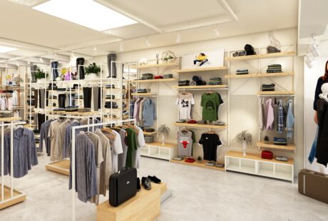 A thoughtfully planned fashion retail interior that emphasizes openness and organization. The clean design... -