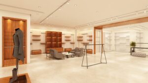 A refined blend of modern architecture and retail functionality defines this interior space. Elegant wall textures, integrated lighting, and open sightlines highlight the merchandise while maintaining a clean and sophisticated aesthetic. The result is a stylish and inviting environment tailored for premium fashion retail.