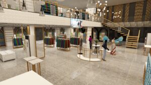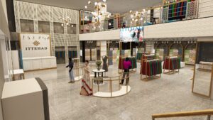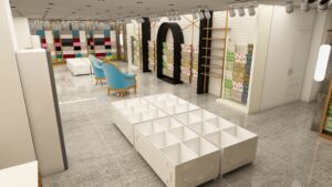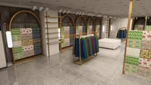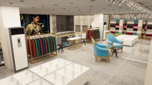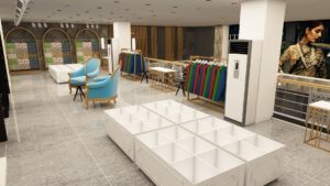 This contemporary retail space is thoughtfully designed to balance elegance and functionality. The open-plan layout, enhanced by high ceilings and layered lighting, creates a spacious and welcoming environment. Clean architectural lines and neutral tones allow the clothing displays to stand out, delivering a refined and premium shopping experience